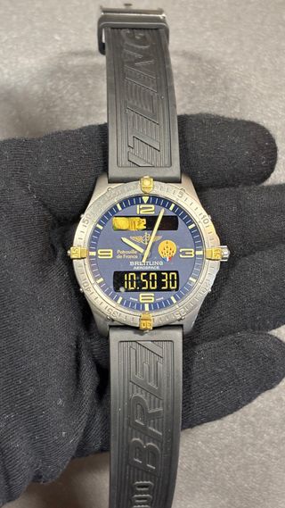 NO NEGOCIABLE. No hacer ofertas. Breitling Aerospace Patrouille de France, referencia F56062, edición limitada a 1953 unidades, dedicada a la escuadrilla acrobática del Ejército del Aire francés. Unidad numerada 1755/1953. Desperfecto en pantalla digital superior, por eso el precio. El movimiento funciona perfectamente. Para mas información no duden en contactarme.