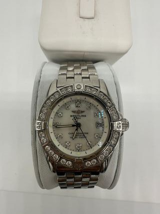 Elegante reloj Breitling Callistino, de la coleccion iconica. - Bisel adornado con diamantes. - Esfera de Madre perla. - Brazalete de acero. - Ventana de fecha. - Resistente al agua 100m/330ft.