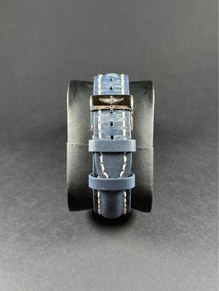 Reloj Breitling Bentley con correa azul y detalles dorados. Un accesorio elegante y deportivo. - Esfera azul con marcadores dorados. - Correa de caucho azul. - Bisel con detalles en rojo y negro.