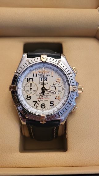INFO POR PRIVADO! VENTA PRESENCIAL ZONA DE (BARCELONA) GRACIAS!! Reloj Breitling Crosswind Especial con cronógrafo automático. Un modelo de edición limitada con un diseño elegante. NO NEGOCIABLE!! NO CAMBIOS!! GRACIAS. - Full Set. - Año 2004. - Revision recien hecha. - Esfera blanca con detalles dorados. - Correa de piel negra. - Resistente al agua hasta 100m/330ft.