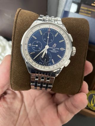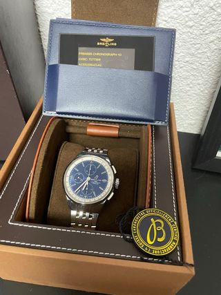 Reloj Breitling Premier Chronograph 42 con certificado COSC. - Esfera azul. - Correa de acero inoxidable. - Incluye caja y documentación original.