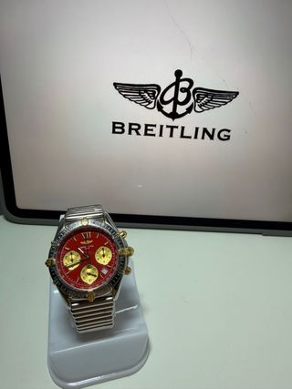 ✨ Características principales: • Caja: acero y oro, diámetro aprox. 37 mm • Movimiento: cuarzo preciso y fiable • Funciones: cronógrafo completo con tres subesferas doradas • Bisel: giratorio con marcadores en relieve • Esfera: rojo intenso con índices dorados y fecha a las 4h • Brazalete: acero tipo elástico (muy cómodo) • Estado: muy bueno, todo funcionando correctamente Un modelo difícil de encontrar en este estado, ¡ideal para amantes de Breitling y coleccionistas de relojes clásicos!