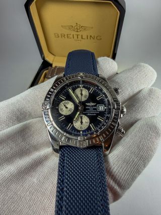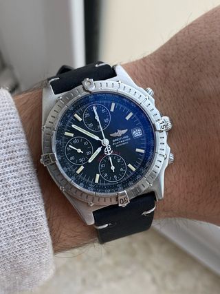 Breitling Chronomat Quartz Ref. 80350 – Oro Macizo – Años 80 Vendo Breitling Chronomat Quartz, referencia 80350, original, correspondiente a la serie profesional de los años 80. 🔹 Marca: Breitling 🔹 Modelo: Chronomat Quartz 🔹 Referencia: 80350 🔹 Movimiento: Cuarzo suizo Breitling cal. 3648 🔹 Caja: Acero inoxidable 🔹 Bisel con “rider tabs” en ORO MACIZO (no chapado) 🔹 Fabricación: Suiza ✅ Funcionamiento: El reloj funciona correctamente, mantiene bien la hora y la fecha cambia sin problema. ⚠️ Estado del cronógrafo: El cronógrafo funciona, pero el pulsador a veces se queda pillado y, en ocasiones, la aguja no regresa exacta