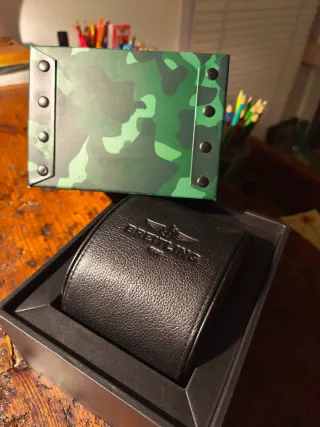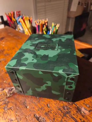 Estuche original de la marca Breitling. - Diseño exterior con camuflaje verde. - Interior en cuero negro. - tiene una raya en el lado exterior