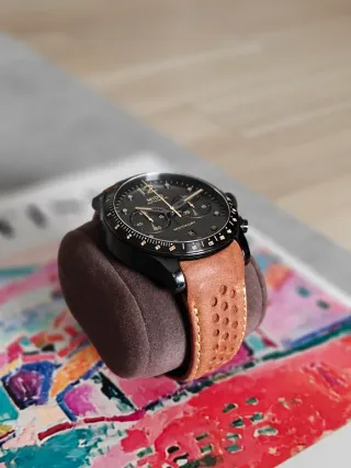 Reloj Breitling Colt con cronógrafo automático. Un accesorio elegante y funcional. - Esfera negra. - Bisel plateado con marcadores. - Correa de tela marrón.