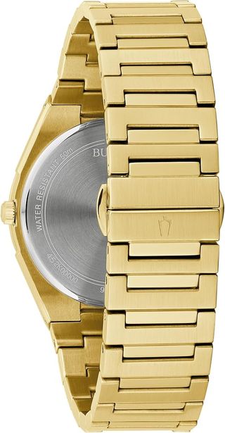 Elegante reloj Bulova con un diseño clásico y sofisticado. - Caja y brazalete de acero con acabado dorado. - Movimiento de cuarzo. - Esfera con patrón texturizado. - Indicador de fecha.