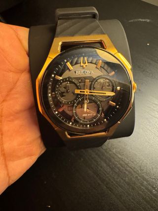 Elegante reloj Bulova con detalles en dorado y correa negra. - Diseño moderno y sofisticado. Bulova Curv (Nitido) Americano Modelo 98a185 44mm Cristal de Zafiro Negocio 100% Seguro ✅