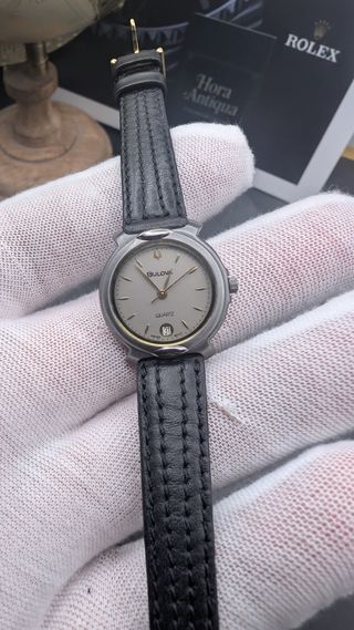 Elegante reloj de pulsera vintage Bulova con correa de cuero negro y caja de plata. Movimiento de cuarzo. Fecha a la hora 3. Correa de cuero. Caja de metal plateado.