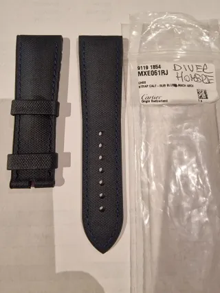 Correa de repuesto para reloj Cartier es original - Modelo: MXE061RJ - Material: Piel de becerro (Calf) - Color: Azul oscuro - Costuras: Azules - Origen: Suiza