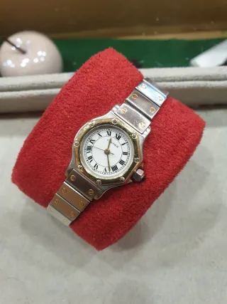 Elegante reloj Cartier Santos de mujer con una combinación de oro y plata. - Esfera con números romanos. - Correa de metal. - Bisel dorado.
