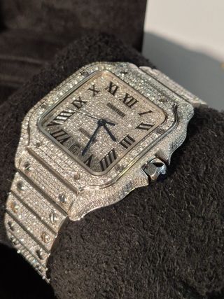 Elegante reloj Cartier Santos con incrustaciones VVS. - Bisel y brazalete cubiertos de diamantes. - Esfera con números romanos y detalles en árabe. - Combinación de oro y plata en el diseño.