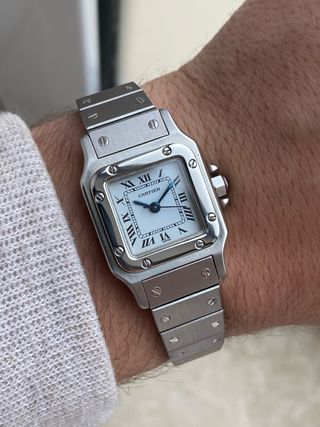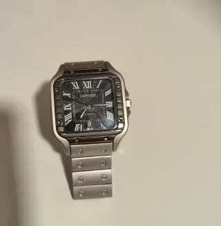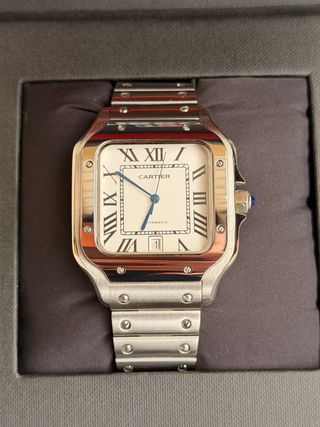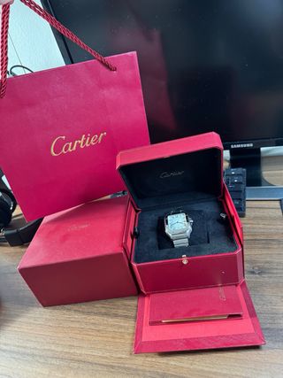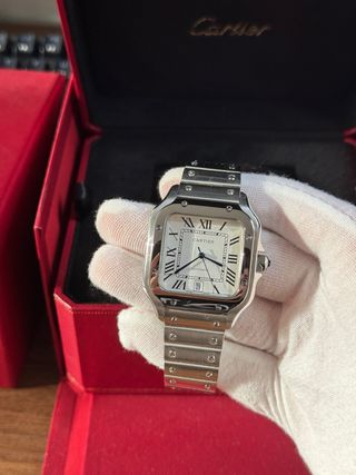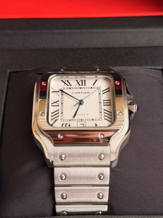 - Cartier Santos 41mm de acero inoxidable de la marca Cartier, con su caja y accesorios sin usar ya que me queda muy grande en la muñeca y no lo quiero - 41mm 🧱 - Caja papel y bolsa - Correa ajustable ✅ - Envío rápido y seguro 💨 - Pregúnteme para más dudas ‼️✅