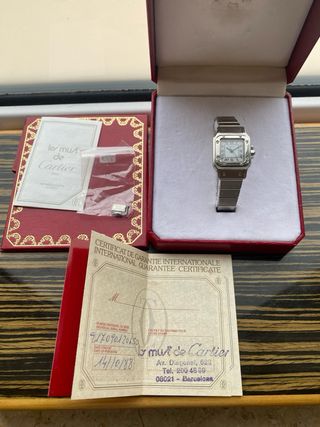 El reloj Cartier Santos de acero inoxidable automático caja: 39,8 mm. Grosor: 9,38 mmes una pieza icónica que fusiona tradición suiza y diseño contemporáneo. En excelente estado, sin signos de uso, incluye todos sus accesorios originales (estuche, documentación y etiqueta de tienda). Con movimiento automático, resistencia al agua de 100 metros y cristal de zafiro, ofrece fiabilidad y sofisticación. Su diseño con esfera plateada, números romanos y ventana de fecha a las 6 lo convierte en una declaración de estilo. Barcelona 7966