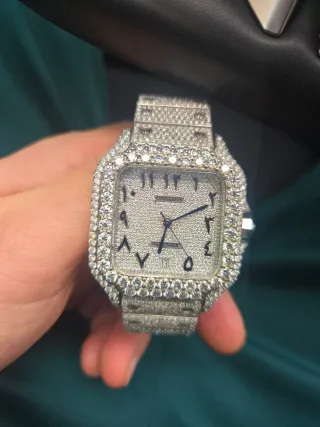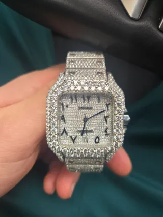 Cartier Santos automático año 2025, convertido en una pieza de alta joyería mediante un trabajo artesanal de micro-pavé realizado a mano. Caja, bisel, carrura, esfera y brazalete completamente endiamantados con diamantes naturales de alta calidad (VS–SI, color G–H, excelente brillo y corte), con un quilataje total aproximado de 9–10 ct. Esfera Arab Dial con numerales árabes, una de las variantes más exclusivas del modelo. Movimiento automático Cartier, cristal de zafiro, corona con cabujón azul y hermeticidad 100 m. Pieza única, irrepetible y no producida en serie, creada para quien busca exclusividad real.