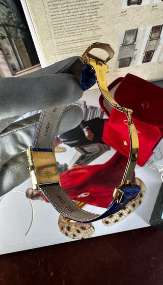Cartier Tank Must, años 80. Modelo clásico rectangular chapado en oro (vermeil), elegante y atemporal. • Caja original chapada en oro, medidas de 31 x 23 mm • Movimiento mecánico firmado, en perfecto funcionamiento • Esfera romana color crema marfil (original Cartier, reemplazada por desgaste • Correa Cartier original de piel de cocodrilo color azul eléctrico / azul royal (nueva) • Cierre desplegable Cartier chapado en oro, excelentes condiciones. La esfera es una Cartier original color crema con textura ligeramente granulada, conocida como Roman Dial – Cream Patina. Fue sustituida en el pasado por desgaste, manteniendo piez