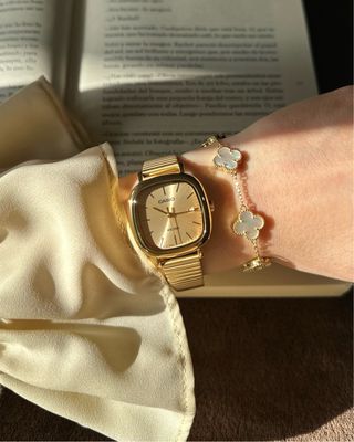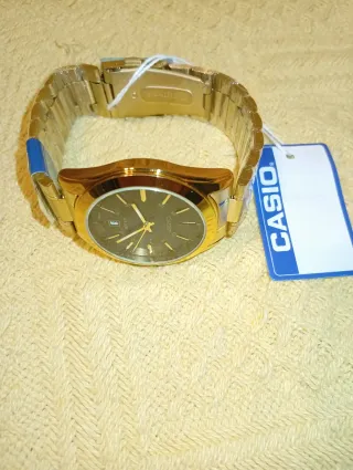 SOMOS TIENDA Reloj Casio con acabado dorado y diseño elegante. - Material carcasa y bisel: acero inoxidable. - Correa de acero inoxidable con cierre ajustable. - Diseño clásico. - Resistencia al agua de 5 bar. - Dimensiones (L × An × Al): 36,7 x 30 x 7mm. - Peso: 54g. - Exterior: vidrio de cristal mineral. - Tratamiento de la superficie: Caja chapada en iones de color oro Correa con revestimiento iónico de color oro. - Tamaño de banda compatible 125 a 185 mm. - Indicación de la hora normal: analógica 3 manecillas (hora, minutos, segundos). Visualización de fecha. Preguntar disponibilidad antes de comprar. Se hacen envíos.