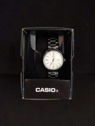 Elegante reloj Casio con esfera blanca y detalles plateados. Su diseño clásico lo hace perfecto para cualquier ocasión. - Correa de eslabones metálicos. - Indicador de fecha. - Resistencia al agua WR 50M.