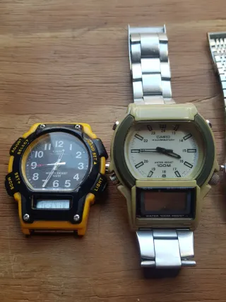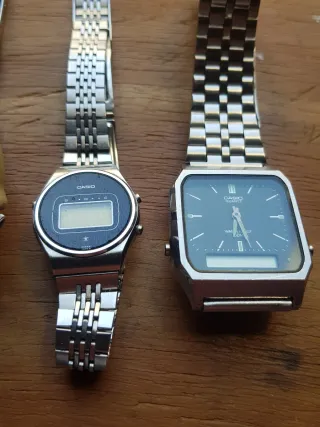 Cuatro relojes Casio de los 90 Mod: Casio AQ-150W (Funcionando). Casio Aw-61 años 90 falta pilas se dejo funcionando también. CasioAqw-55 Casio vintage ladies - Un reloj digital con pantalla LCD. - Un reloj analógico con esfera. - Brazaletes de metal plateado.