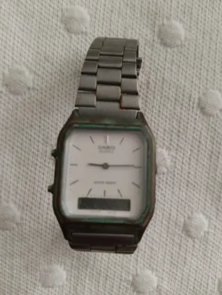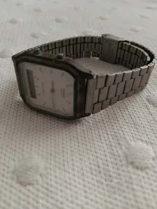 Este reloj Casio combina un diseño clásico con detalles en dorado y plateado. El digital funciona pero el analógico está parado y por eso el precio. - Esfera con números arábigos. - Correa metálica ajustable. - Resistente al agua. - Made en Japan