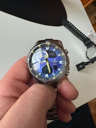 Reloj Casio Edifice con esfera azul y detalles plateados. Combina un diseño analógico con una pantalla digital. El cristal esta algo rallado No tengo su pila para probar su funcionamiento - Resistente al agua WR100M. - Función iluminador para visibilidad nocturna. - Correa de metal plateado.