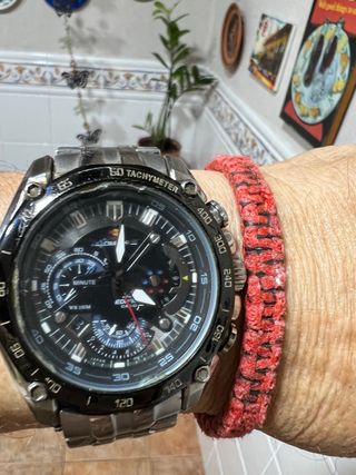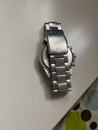 Reloj Casio Edifice cronógrafo – Funcionando perfectamente Se vende Casio Edifice original, en perfecto estado de funcionamiento. Todas sus funciones funcionan correctamente: hora, cronógrafo y calendario. El reloj está en muy buen estado general, con desgaste normal de uso. ⚠️ Único detalle a mencionar: el cristal tiene una pequeña mancha en la parte inferior izquierda, visible en la foto. No sé exactamente de qué es, no afecta a la lectura ni al funcionamiento del reloj. Características: • Cronógrafo totalmente operativo • Calendario • Acero inoxidable • Movimiento japonés • Resistente al agua (WR 100M)
