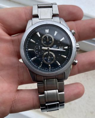 Reloj Casio Edifice con un diseño deportivo y elegante. Hay que ponerle pila y pulirlo el cristal está perfecto y funciona a la perfección . Algo negociable . - Esfera negra con detalles plateados. - Correa de acero inoxidable. - Bisel con marcadores de tiempo.