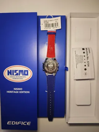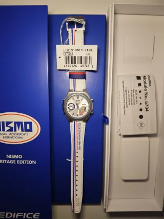 Reloj Casio Edifice Nismo Heritage Edition, modelo ECS-S10NIS-7AER. Reloj totalmente nuevo, sin uso. Pieza de coleccionismo, muy limitada, conmemorativa del viejo logo de Nismo y los vehículos que ganaron con ella. Cristal de zafiro, correa de piel y ante en colores Nismo y carcasa de acero resistente al agua.
