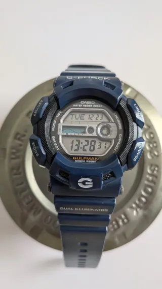 ** PRECIO DEFINITIVO** ** NO RESPONDO A REBAJAS ** Reloj Casio G-Shock Gulfman G-9100 en color azul. Master of G G-9100-2ER. Un clásico de los 2000, era dorada de Casio. - Resistencia al agua de 20 BAR. - Pantalla con doble iluminador. - Resistente a golpes. - Partes metálicas de titanio. - Indicador de mareas y fase lunar. Incluye su caja y toda la documentación. Comprado en tienda física en 2008. Perfecto estado de funcionamiento.