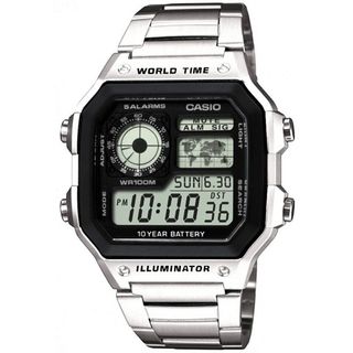 Reloj Casio con acabado plateado y detalles en negro. Cuenta con una correa metálica.Reloj de Pulsera · Marca : CASIO · Modelo : AE-1200WHD-1AVEF · Referencia : 19219 · Colección : Youth · Género : Hombre · Tipo Display : Digital · Movimiento : Cuarzo japones · Funciones : Alarma Cronometro Horarios internacionales Timer · Estilo : Deportivo · Color General : Plateado · Forma del Reloj : Cuadrado · Color de Esfera : Negro · Material de la Caja : Plateado · Diámetro de la Caja : 42 milímetros. · Grosor de la Caja : 18 milímetros. - Resistente al agua WR100M. - Batería de 10 años. - Iluminador. - Hora mundial. - 5 alarmas.