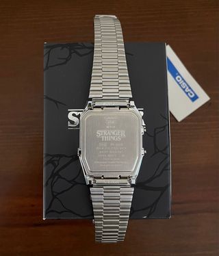 ⌚ Reloj Casio x Stranger Things – Edición Limitada Retro 👾. Diseño exclusivo con estética vintage ochentera y detalles de la serie, ideal para fans y coleccionistas. Formato digital, movimiento de cuarzo, batería, alarma, cronómetro, iluminación y resistencia al agua 30 m. Caja de 34 mm, grosor 9 mm y correa plástica de 20 mm con cierre de hebilla. 🖤 Producto nuevo y precintado. Una pieza única de colección. 👉 Mira bien las fotos y si tienes dudas, pregunta, que responderé encantada. 🚫 No se admiten devoluciones no justificadas.