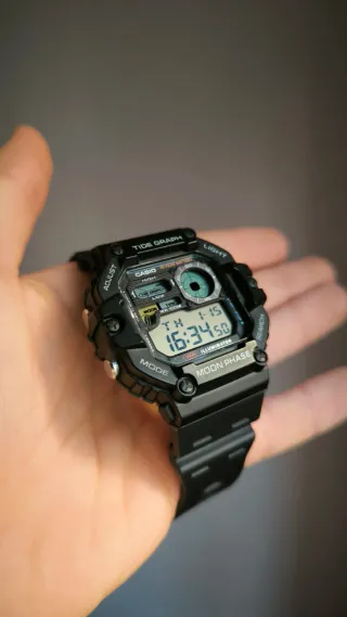Reloj Casio con funciones de fase lunar y gráfico de mareas. - Esfera digital con iluminación. - Correa de resina negra. - Resistente al agua (WR 100M).