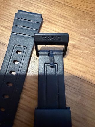 Correa de repuesto para reloj Casio. - Material de goma resistente. - Hebilla metálica negra. - Diseño con múltiples orificios ajustables.