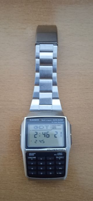 DATA BANK multilingüe Combine un reloj digital con una calculadora de 10 teclas y verá lo práctico que es tener una calculadora de 8 dígitos en un reloj de pulsera. Una gran pantalla LCD de alto contraste facilita la lectura de las cifras. Otras características incluyen funciones de banco de datos, visualización del día de la semana en 13 idiomas y batería de 10 años de duración para un funcionamiento ininterrumpido. • Banco de datos con memoria para un máximo de 25 entradas • Banco de datos compatible con los caracteres de 13 idiomas • Calculadora de 8 dígitos • Conversión de divisas • Cinco alarmas multifunción • Hora dual para realizar....