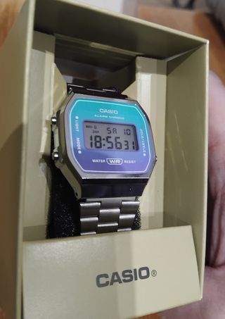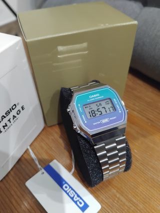 Reloj Casio con un diseño retro y moderno. La esfera presenta un degradado de colores que va del azul al morado, con detalles plateados. - Correa de acero inoxidable. - Pantalla digital. - Resistente al agua.