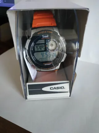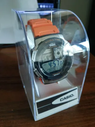 NO NEGOCIABLE Es un regalo de Reyes de este mismo año . Está sin estrenar con caja , protector de pantalla y manual,etc.Lo vendo porque no me termina de convencer la estética Reloj Casio digital con correa de color naranja y detalles plateados. Resistente al agua hasta 100 metros. - Correa de resina naranja. - Caja de resina plateada. - Pantalla digital. Ok - Resistente al agua WR100M. - Batería de 10 años.