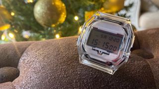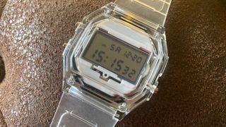 Reloj digital con un diseño moderno y transparente. - Caja octogonal transparente. - Pantalla digital. homenaje al Casio F91W