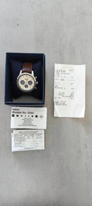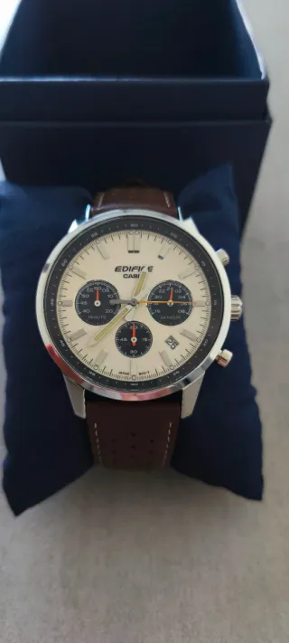 Reloj Casio Edifice con módulo 5344. Incluye caja original, manual de usuario y tarjeta de garantía. Usado en 1 ocasión exactamente. Comprado nuevo el 22/07/2025, con ticket de garantía. No hago envíos. - Esfera blanca. - Correa de cuero marrón. - Resistente al agua.