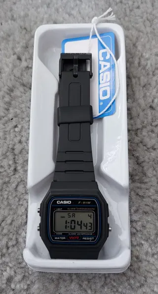 Reloj digital Casio F-91W, un clásico atemporal. - Correa de resina negra. - Pantalla digital. - Resistente al agua.