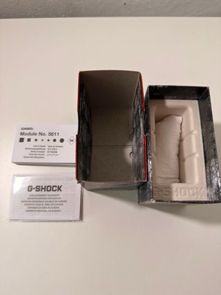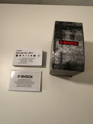 Se vende caja vacía de reloj G-Shock, modelo 5611, junto con la documentación de garantía para Europa. - Caja original G-Shock. - Incluye manual de usuario. - Documentación de garantía regional para Europa.