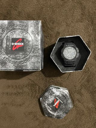 Reloj Casio G-Shock con detalles en dorado. - Caja hexagonal. - Correa negra. - Esfera con múltiples indicadores. No hago envíos