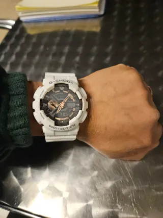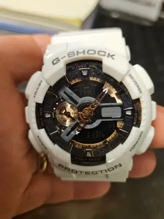 Reloj Casio G-Shock GA-110 con un diseño llamativo. Blanco oro - Correa de resina blanca. - Detalles en tono dorado en la esfera. - Resistente a golpes y al agua.