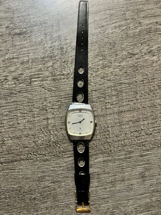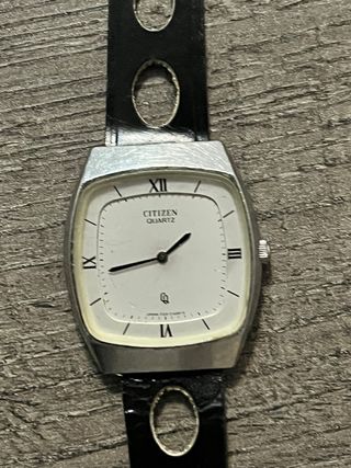 Elegante Citizen Quartz de diseño clásico y atemporal, perfecto para quienes buscan un reloj fino, ligero y con la fiabilidad japonesa que caracteriza a la marca. Marca: Citizen Cuarzo japonés (6031) – precisión y bajo mantenimiento Diámetro: 34 mm aprox. sin corona (ideal para hombre o mujer) Esfera: Plateada minimalista con índices aplicados Correa: Piel negra estilo cocodrilo (nueva, no original)