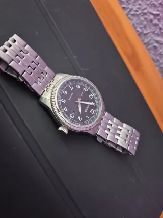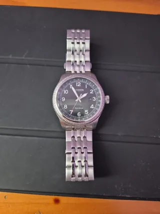 Fuunciona perfectamente, alimentado por energía solar (no necesita pila). Dial negro con números grandes blancos y agujas luminiscentes. Caja y brazalete de acero cepillado, bisel tipo “coin edge” decorativo. ✅ Movimiento solar Citizen calibre E111 ✅ Diámetro aprox. 42 mm ✅ Resistencia al agua 100 m ✅ Cristal mineral Estado: muy buen estado, apenas usado