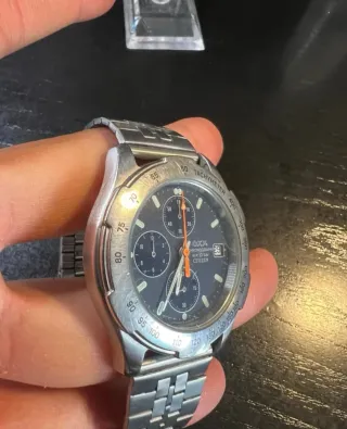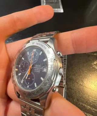 Reloj de pulsera Citizen con movimiento de cuarzo y resistencia al agua. - Bisel giratorio con marcaciones en azul y naranja. - Indicador de día y fecha. - Correa de metal plateada... falta poner pila.. correa armis rolex