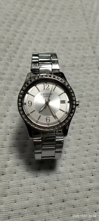 Elegante reloj para señora de la marca Citizen. - Diseño con bisel adornado con pedrería. - Esfera plateada con detalles texturizados. - Indicador de fecha. - Brazalete de eslabones metálicos.