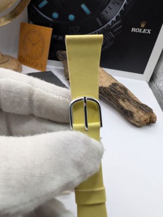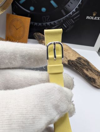 Cinturino originale Citizen nuovo, fondo di magazzino (NOS). Misura 13 mm. - Colore giallo. - Materiale in pelle. - Chiusura a fibbia in metallo.
