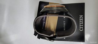 Caja original para reloj de la marca Citizen. Presenta un diseño elegante en color negro con una banda plateada. - Color: Negro - Marca: Citizen