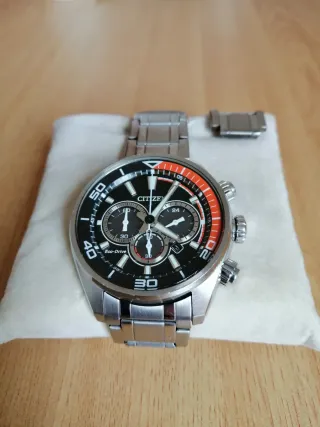 Se vende este reloj Citizen con tecnología Eco Drive que economiza la pila y aunque esta se acabe continúa dando la hora. Reloj robusto y pesado con bastante uso pero continua en muy buenas condiciones, el reloj no tiene caja pero se envía bien protegido. - Esfera negra con detalles plateados y naranjas. - Bisel giratorio. - Cronógrafo. - Indicador de 24 horas.