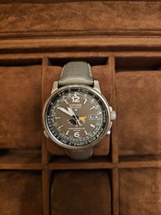 Reloj Citizen Eco-Drive con un diseño y estética inspirado en Oris Big Crown. La esfera es de color azul oscuro y la caja y la correa son de acero inoxidable. Comprado para probar y usado en dos ocasiones. Está de reestreno. Se vende porque estoy usando relojes más pequeños. - Mecanismo Eco-Drive E111 - 42mm de caja. - Esfera azul oscuro. - Bisel interno con escala. - Correa de acero inoxidable de eslabones macizos. - Incluye eslabones sobrantes, caja y documentos. - Cristal mineral endurecido - Buen lumen. No me interesan cambios y no contesto a regateos. Citizen Seiko Oris Rolex Tudor Casio Glycine Panerai