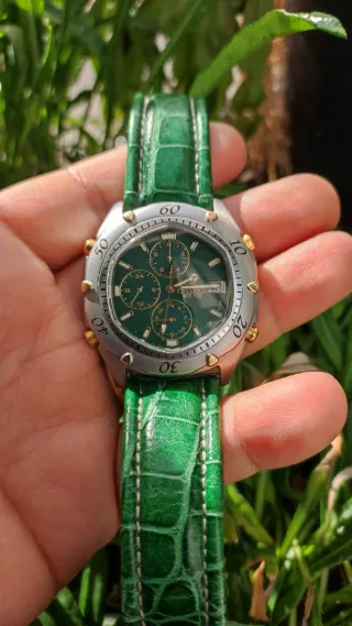 Reloj Citizen con correa de piel verde y detalles dorados. - Esfera verde con cronógrafo. - Correa de piel con acabado texturizado. - Bisel con marcadores dorados. - Full Set